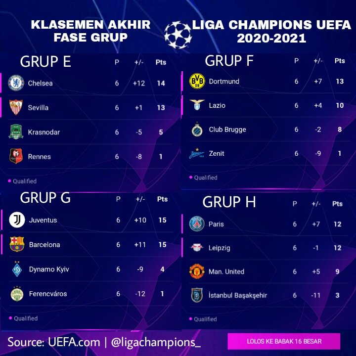 Tiket Babak 16 Besar Liga Champions sudah dipegang oleh 6 tim yakni Chelsea Barcelona Sevilla dan Juventus Manchester City dan Bayern Munchen. Hasil Liga Champions Tadi MalamResult matchday 1 UEFA Champions League 20202021Hasil Liga Champions 20202021 matchday 1Hasil bola tadi malamHasil liga Cham. Simak informasi penting terkait Liga Champions 202122 mulai dari jadwal hasil hingga topskor turnamen.